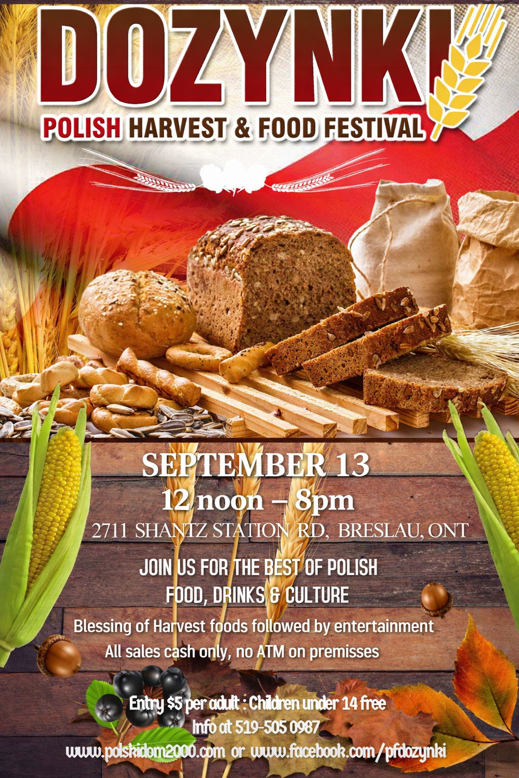 Polish Food Festival 12 noon - 8pm. Please join us this year to celebrate the Polish Harvest & Food festival/Dozynki, September 13 and experience traditional Polish foods and culture. Dozynki is a celebration of thanksgiving after a bountiful harvest dating back to 16th century Poland. It remains a long-standing tradition in Polish communities throughout the world, including right here, the Kitchener-Waterloo region! This year’s Dozynki/Harvest Festival will feature blessing of the harvested foods at 1pm, live entertainment including polish folk dancing in traditional costumes by Radosc Joy and Kujawiacy Polish Song & Dance Ensamble. Enjoy delicious polish food including authentic favourites like pierogi, golabki (cabbage rolls),Bigos (hunters stew),potato pancakes. pastry by polish bakery ........ and of course polish sausage, drinks plus much more! Cash sales only Be Polish for a Day Free parking, children’s playground, Bouncing castle. Admission: $5 per adult. Children under 14 free of charge For more info please contact event manager Jan (519 505-0987